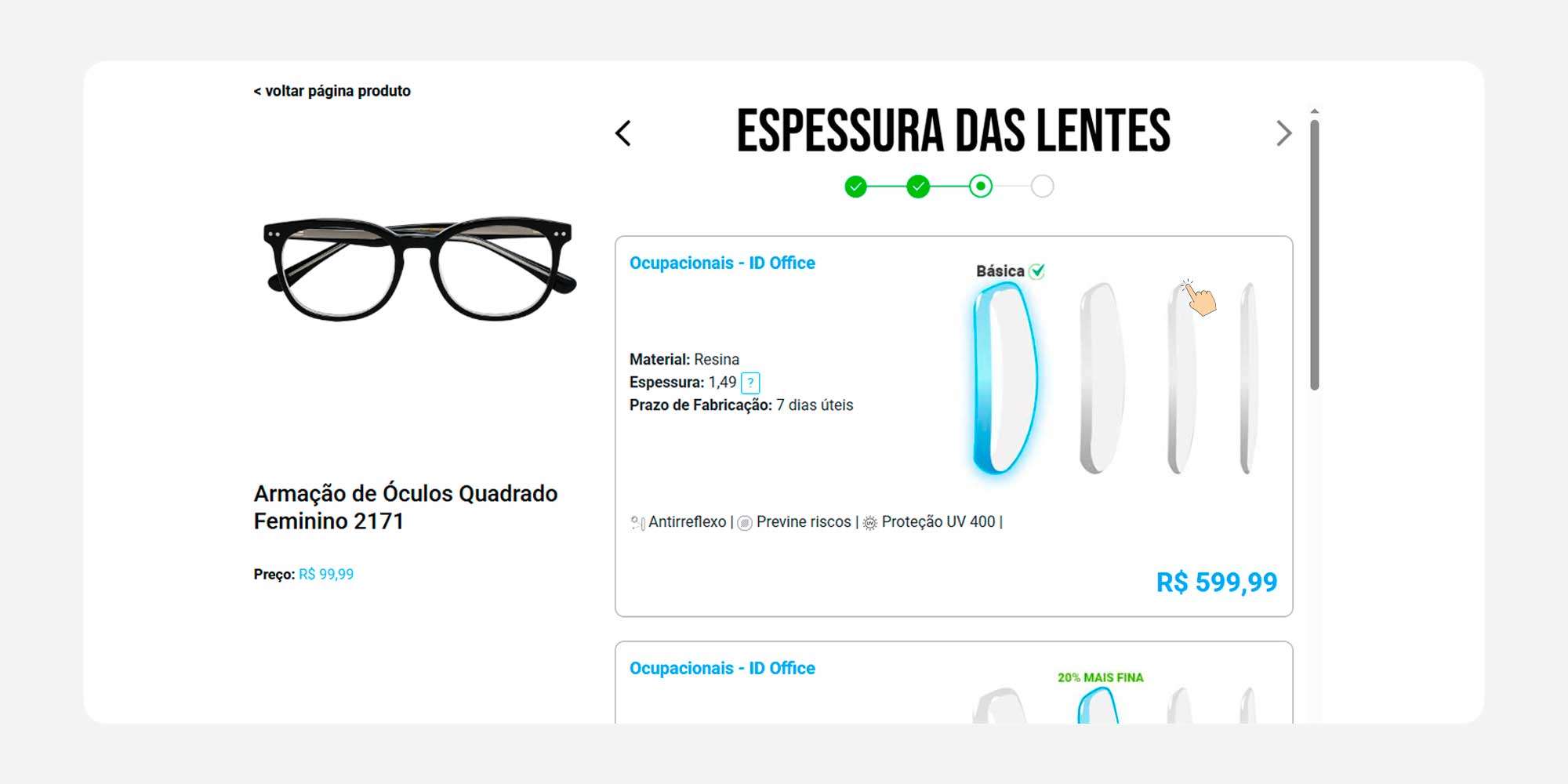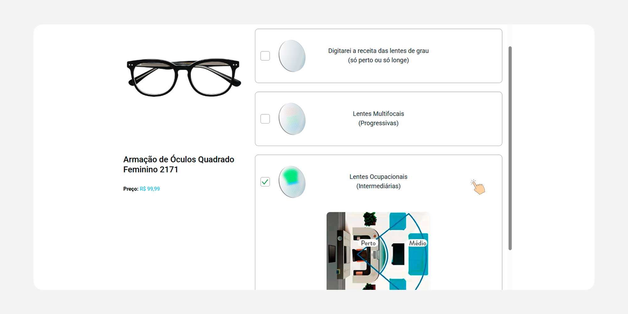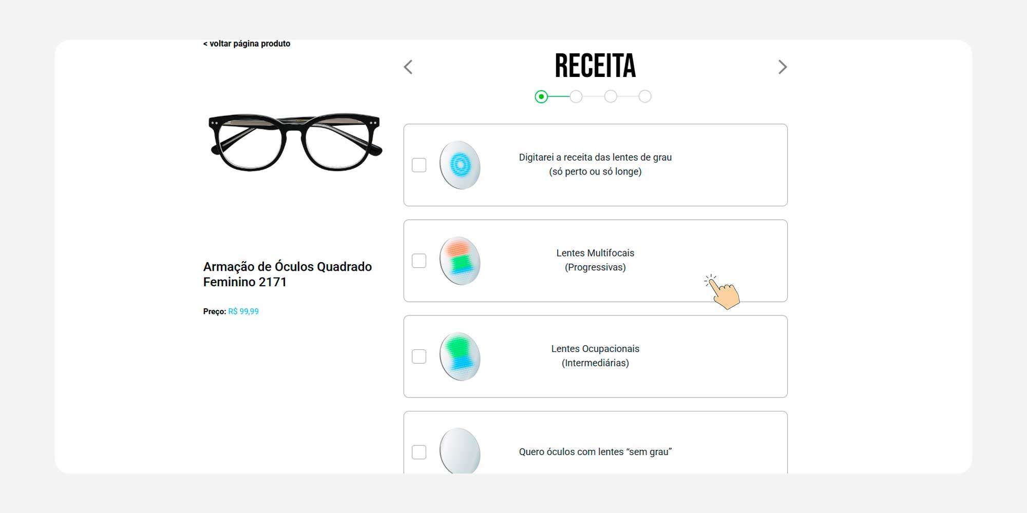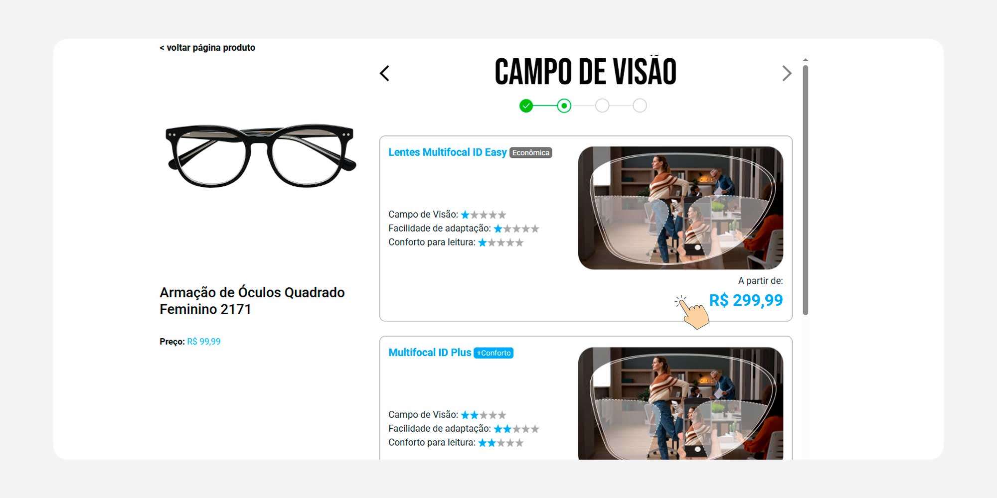 Agora escolha o campo de visão e benefícios da lentes mais necessários para o seu estilo de vida.