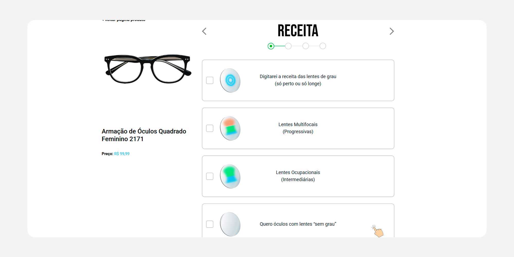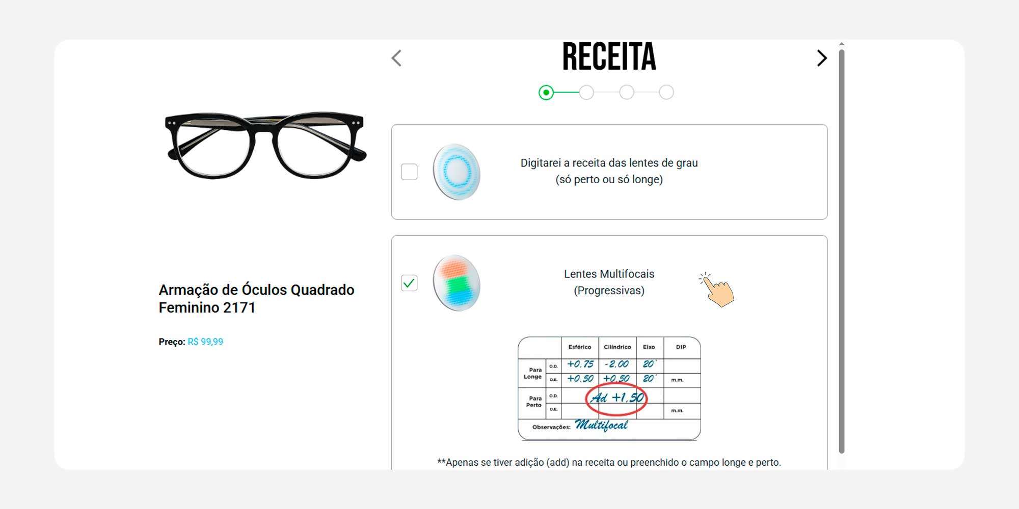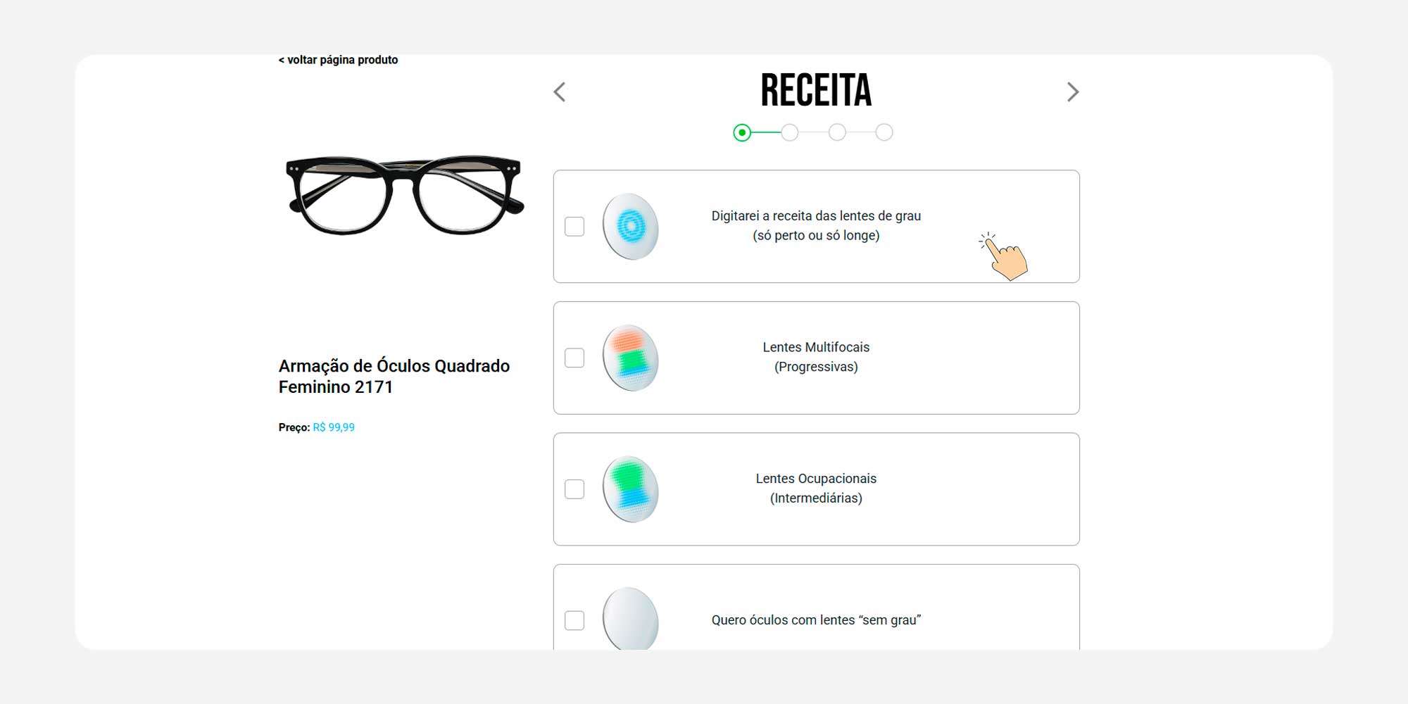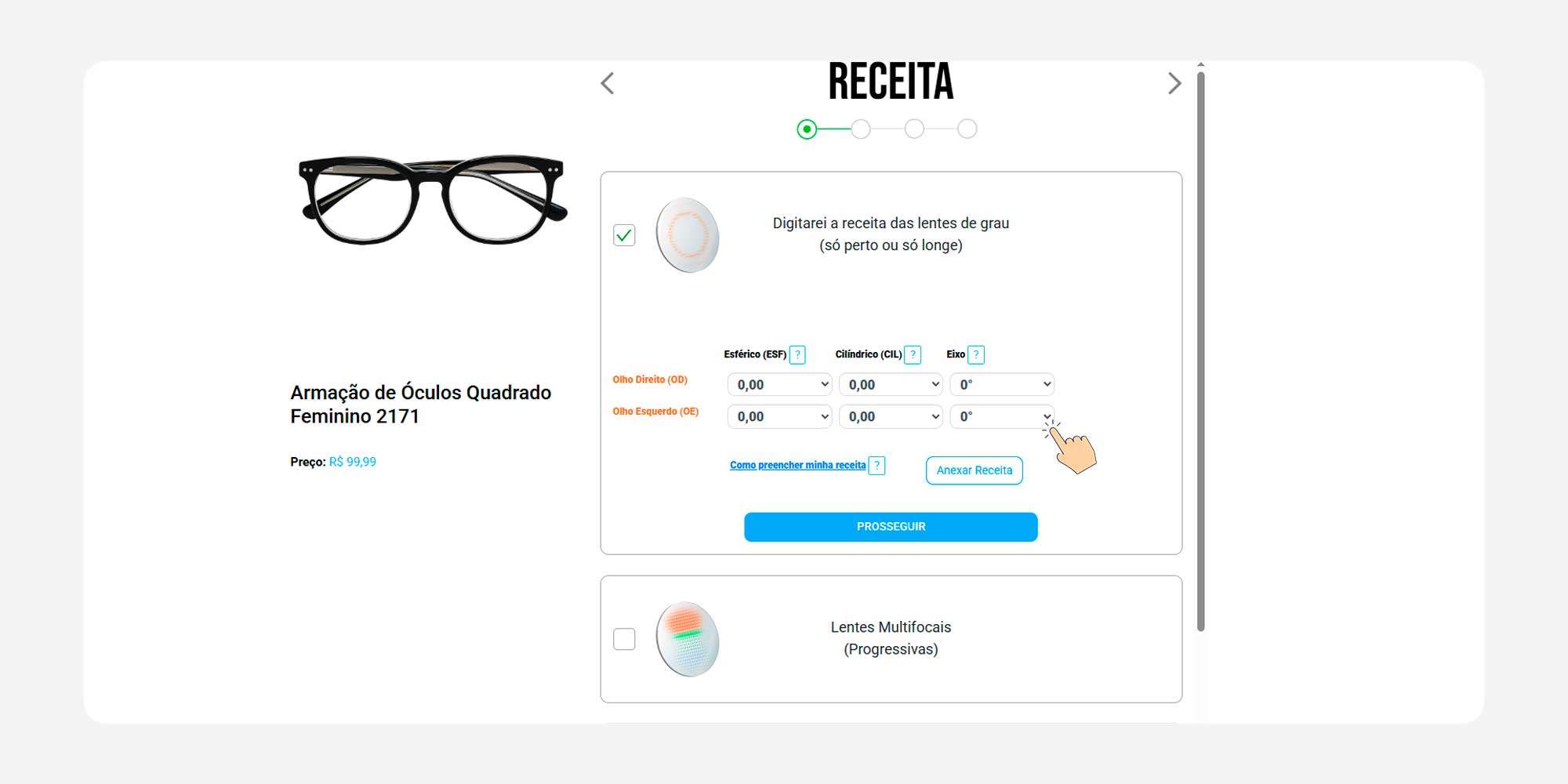 Clique no botão "escolher lentes" e siga para preencher a receita do médico